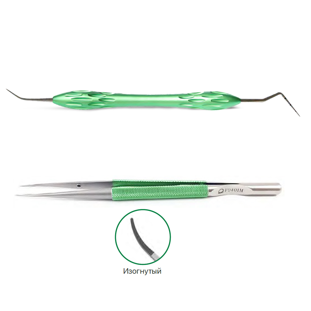 Набор инструментов: Зонд двусторонний и пинцет микрохирургический для нитей, изогнутый.