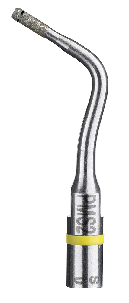 Насадка для скайлера PM2, с алмазным покрытием, для препарирования уступа. Прямой плоский кончик. Первичное препарирование осуществляется с помощью вращающихся инструментов до линии эмалево-дентинного соединения. Далее используется насадка c алмазной крошкой PM1 (выпукло-закруглённая) или насадка PMS 1 с закруглённым внутренним углом для смещения линии обработки в апикальном направлении, затем PM2 или PMS2 – насадка с мелкой алмазной крошкой, в зависимости от выбранного контура препарирования, для препарирования и полировки дентина. Она также имеет лазерную маркировку, находящуюся на расстоянии 1 мм от края её активной части. Ультразвуковыми насадками заглаживаются бороздки от алмазных боров и уступ погружается под десну. Эти насадки имеют значительное преимущество при формировании текстуры поверхности дентина по сравнению с бором и используются для ультразвуковой финишной обработки.