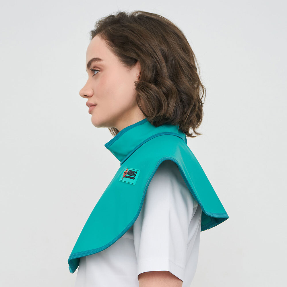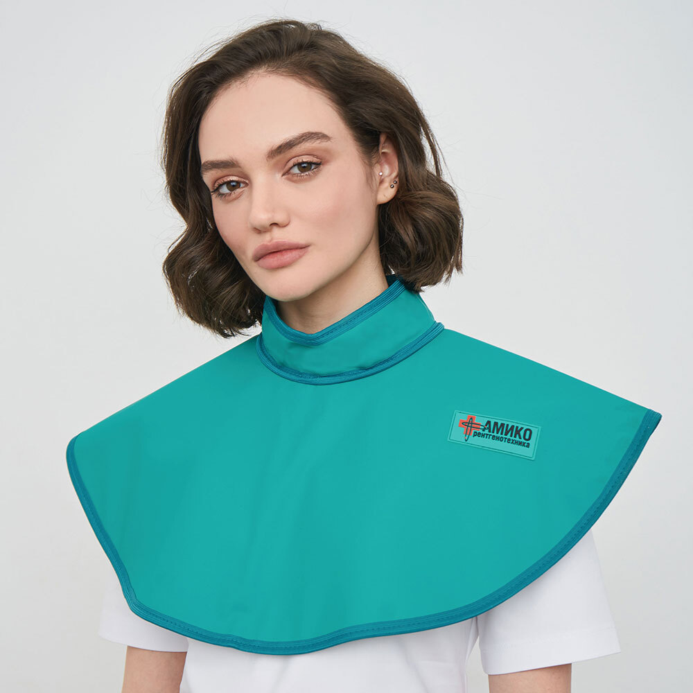 Пелерина предназначена для защиты щитовидной железы и внутренних органов пациента в районе плечевого пояса и верхней части грудной клетки при черепных и стоматологических исследований пациента применяются так же стоматологический фартук для ортопантомографа с воротником. Для стоматологов же специально разработана модель фартука с воротником-стойкой.
