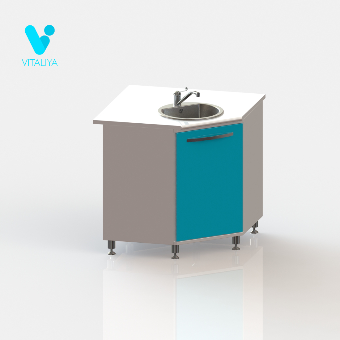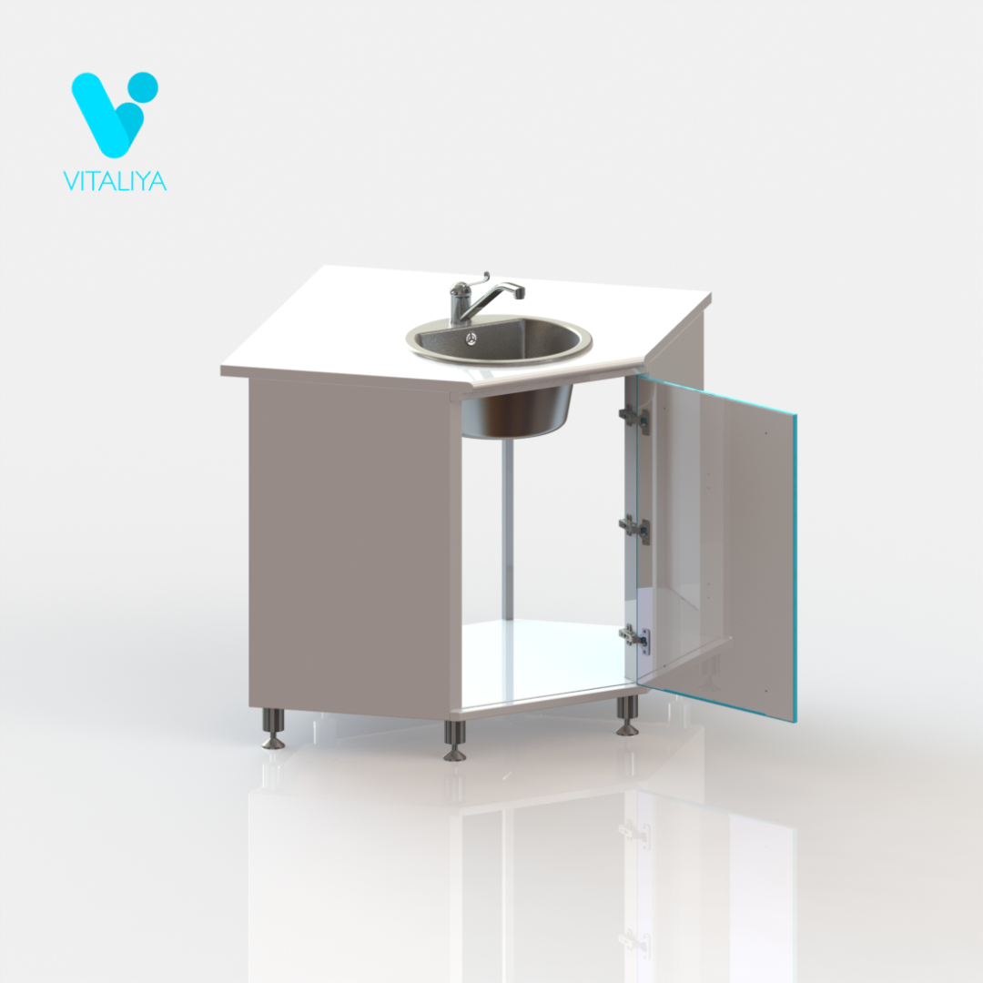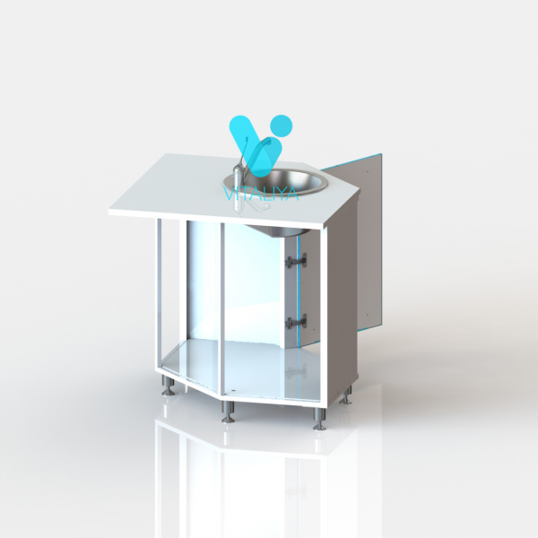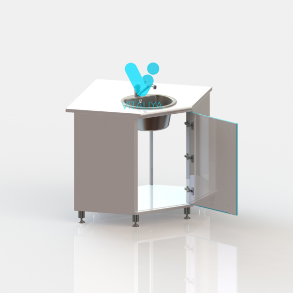 Тумба угловая с дверцей, с вырезом в задней стенке для подвода коммуникаций, оснащена мойкой из нержавеющей стали, локтевым смесителем, сифоном.
