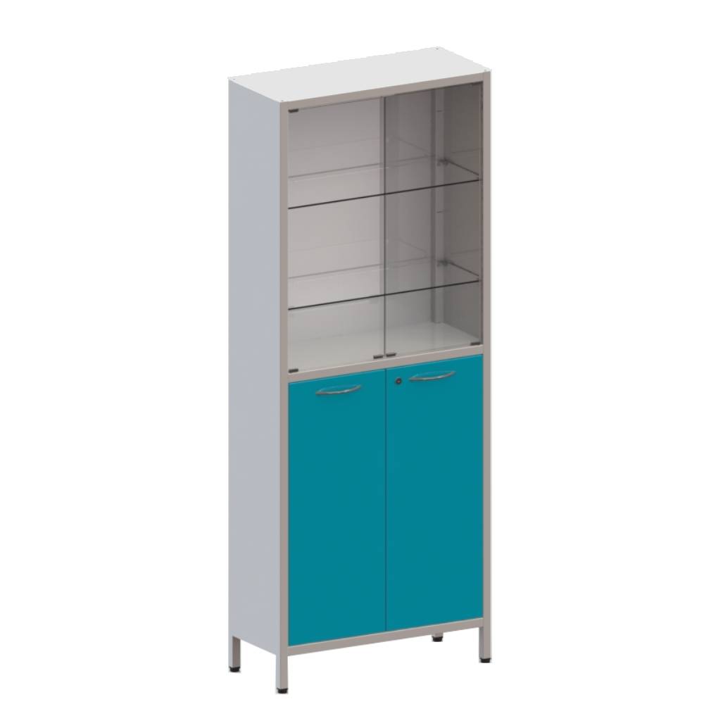 Двухстворчатый. Верхняя секция с дверьми из стекла. Внутри 2 стеклянные регулируемые полки. В нижней секции метал. двери с замком и полкой.