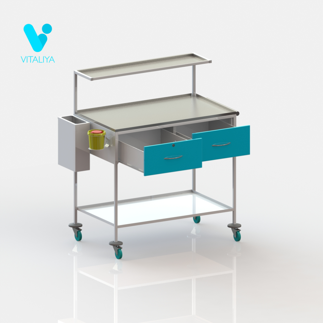 Столик медицинский СММ-01, каркас выполнен из профильной трубы 20 х 20, корпус и нижняя полка из листа холоднокатаной стали толщиной 1 мм. Рабочая поверхность и верхняя полка из нержавеющей стали. Ящики установлены на роликовые направляющие, левый ящик укомплектован замком. На левой стенке столика расположен держатель мусорных пакетов и контейнер для медицинских отходов класса «Б». На правой стенке ручка для перемещения. Столик установлен на колёсные опоры диаметром 75 мм, два колеса с тормозом.