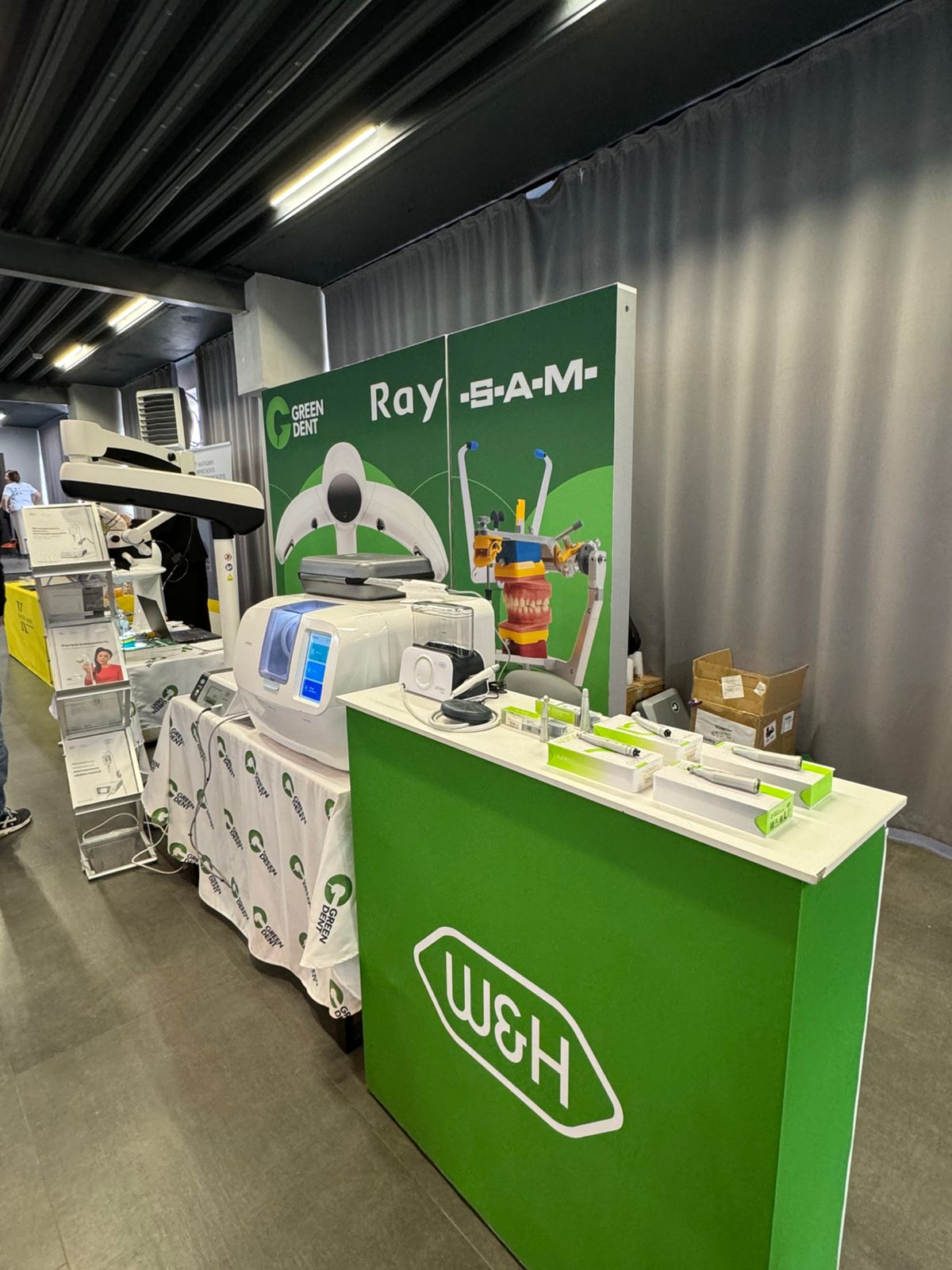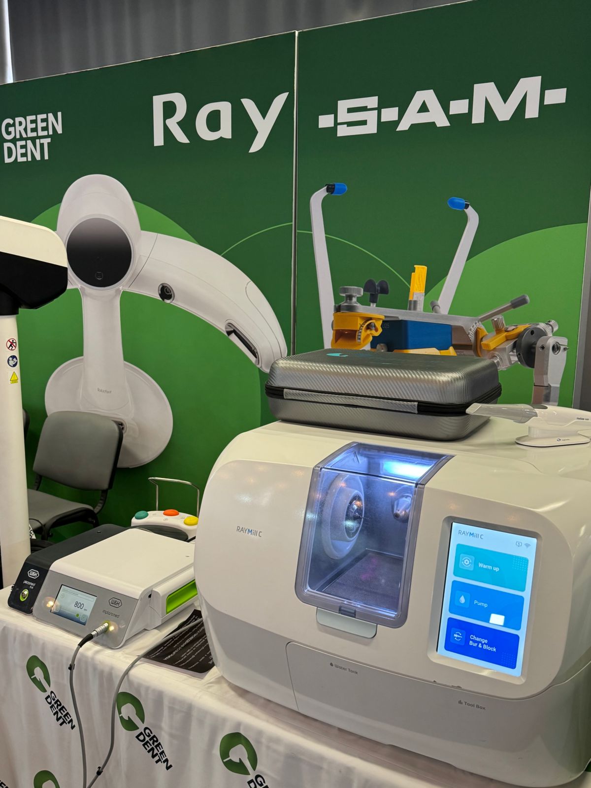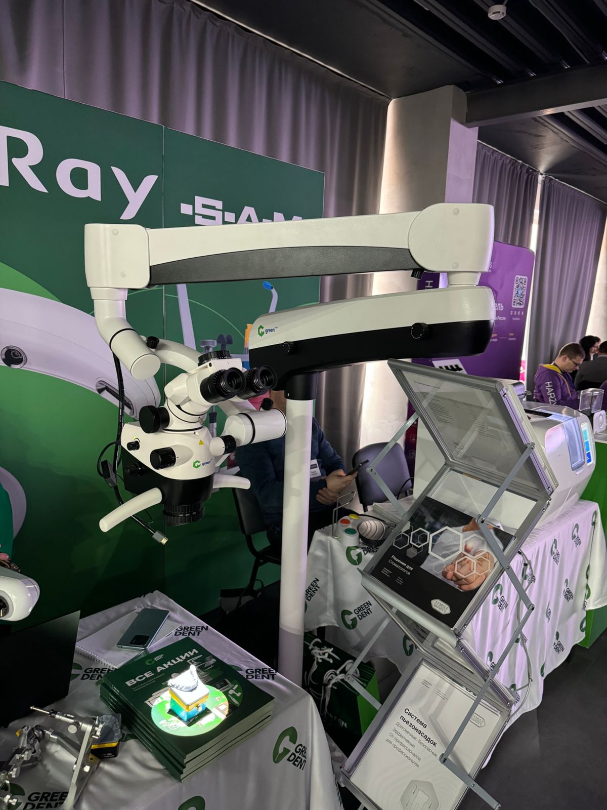 Ну а компания GREEN DENT? — А компания GREEN DENT представила инновационное стоматологическое оборудование, в числе которого: стоматологический операционный микроскоп GreenMED C-Clear, технологии W&H, 3D-сканер лица RAYFace и фрезерный станок RAYMill C.